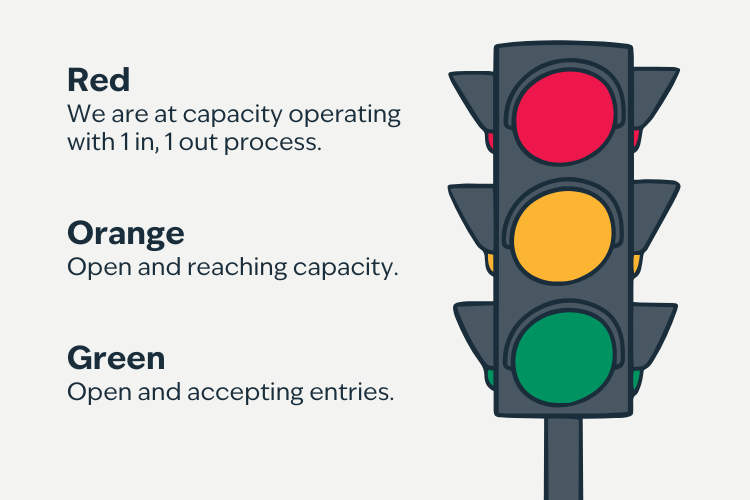 Red – we are currently at capacity and operating with 1 in, 1 out processes